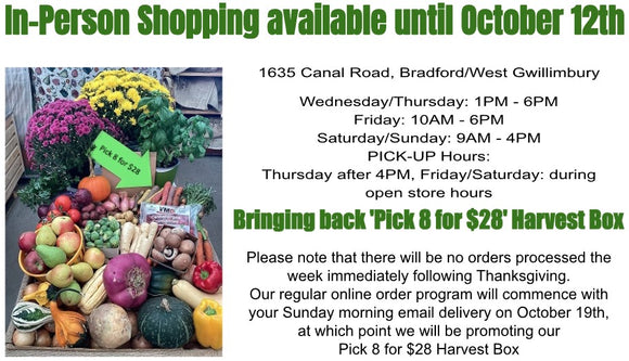**Orders placed before 10pm WED will be ready for pick-up THU 4pm-8pm, FRI 10am-8pm or SAT-SUN 9am to 4pm.
